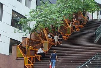 Uno de sus ejemplos fue el denominado “Cascade Project” consistente en una “escultura” asimétrica, ascendente formada de malla metálica, rodeada de árboles y un sistema de iluminación que otorgan otra capa de intervención para la apropiación de los peatones, instalada en una escalera urbana sin mayor atractivo inicial.