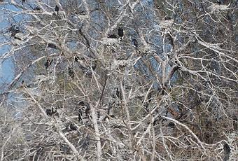 Como cada primavera, los pájaros andan afanados en construir sus nidos para poner los huevos e incubarlos. (En la foto superior, un árbol repleto de nidos de cormorán grande Phalacrocorax carbo, en el zoo de Budapest el 24 de abril). Esto supone un trabajo y un esfuerzo considerables para unos y un aporte de alimento fácil para otros. Las urracas, aves que considero bastante inteligentes, estarán vigilantes en los ires y venires de los pajarillos con ramitas y otros materiales. Pronto dispondrán de multitud de nidos con huevos para robar y usarlos como alimento. No es raro en esos días encontrar restos de huevos en el suelo que hayan sido devorados por las urracas. No sólo son ellas las que devoran huevos, también las gaviotas son expertas en obtener este tipo de alimento. Cuando vacían un nido, los padres deberán de hacer una puesta de reposición que les permite que no se vaya al garete la época de la reproducción. Pero no todos los restos de huevos que encontramos son debidos a que alguien se los ha comido. Las cáscaras de los huevos de los que eclosionan los polluelos, también aparecerán tiradas por el suelo, ya que los padres los transportan lejos del nido. Una mirada atenta nos permitirá diferenciar los unos de los otros.