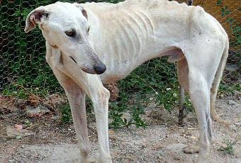 Esta de nuevo en adopción, es un precioso galgo blanco sacado de un infierno junto con Ada, Fido y las 2 podenquitas Greta y Deisy....