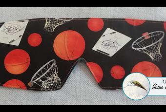 Este antifaz es para mi cuñado. Para la siesta le gusta aislarse de luz y sonidos con un antifaz grande y grueso que yo le hice (lo puedes ver aquí), pero en verano prefiere uno más fino aunque no le aísle de igual modo. He usado una tela fina de algodón con estampado oscuro y doble gasa azul pavo oscuro, que es fresca. El estampado como os digo es de fondo negro con pelotas y canastas de baloncesto, que ya puestos, le va perfecto a él.
