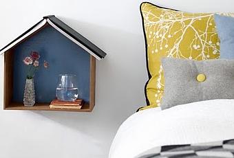 Hay ideas que llevan a los muebles al terreno de la imaginación más absoluta, es el caso de estas mesita de noche con forma de casita colgada en la pared. Si os fijais su realización es bien sencilla, a penas son un par de tablas colocadas de una manera simple pero que adquieren un efecto realmente genial. ¿Lo que más nos ha gustado? ... El techo de esta casita mesilla de noche que es un libro abierto que simula un tejado a dos aguas.via|Style at Home