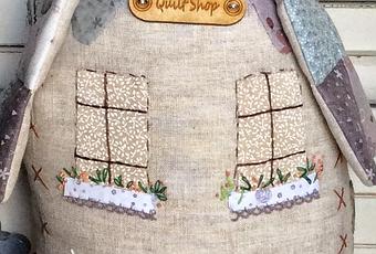 De lino toda ella, sobrantes de telas para las aplicaciones y, lo más que me ha gustado, las telas de Lynette Anderson, de la colección Pocketful of Daises, para el tejado y las piedras de las fachadas.