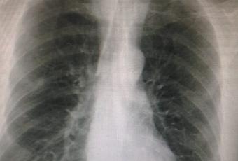 Imagen radiopaca proyectada en el primer arco costal derecho de 4.5 mm. que sugiere granuloma pulmonar calcificado