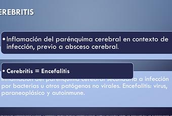 - Inflamación del parénquima cerebral secundaria a infección por bacterias u otros patógenos no virales. Encefalitis: virus, paraneoplásico y autoinmune.