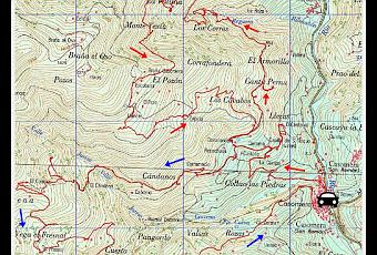 Sobre las 8:15 h empezamos a caminar saliendo inmediatamente al Oeste por un camino que discurre paralelo a los praos de L´Arenal penetrando así en el angosto valle del río Carrena que cruzamos por un puente obviando el camino que sigue el frente. Después, subimos la empinada cuesta hasta llegar a la bifurcación con tres cabañas de Bustiel.lo
