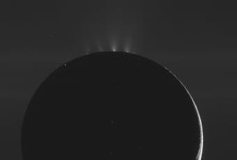Varias imágenes muestran Encelado a contraluz, con la silueta oscura de la luna coronada por chorros brillantes que brotan de su región polar sur. Las imágenes muestran varios chorros que salen de las fracturas conocidas como las "rayas de tigre". Los científicos usarán estas imágenes para identificar los lugares donde se originaban los chorros, así como también para aprender sobre su forma y su variabilidad.