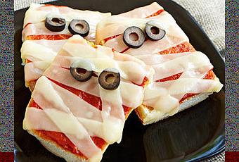 El viernes, en el súper, veía a una niña llorar desconsolada delante de un expositor lleno de miembros de plástico ( manos, brazos, pies, dedos…) con su conveniente reguero de sangre brillante (plastificado). Más allá, las máscaras de Scream, los gorros de bruja…Y más allá de allá, los disfraces: horrorosos ( y ya no te digo nada de los que pretenden ser sexys!!!) . A la vuelta del más allá, otro expositor rebosante de los ingredientes para hacer los panellets, las castañas, los moniatos y el moscatel… La niña ha estado sollozando todo el tiempo. No me extraña…Imagínate si esa noche, le toca comer esta pizza-momia de Halloween … ; – )