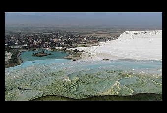 Las piletas calcáreas constituyen un espectáculo excepcional. Desde hace unos años no se permite bañarse en las mismas. En un lugar cercano está la llamada piscina de Cleopatra donde es posible hacerlo.La actual ciudad de Pamukkale está construida al pie de las cascadas.Hierápolis