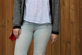 Hoy os traigo un outfit súper sencillo y lleno de luz para el día a día. Como veis he elegido una blusa blanca con aires babydoll y unos jeans desgastados de Zara, una chaqueta con un toque chanelero y unas zapatillas con plataforma para darle ese toque sport. Además he seguido con mi linea y he añadido un bolso rojo para darle el toque de color. ¡Me encantan este tipo de outfits!