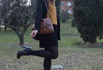 Una camisa de Mango mostaza, y una falda de H&M de tablas en negro crea un conjunto muy básico con ese punto de color. El blazer negro acaba de indicar que este estilismo es idóneo para gestiones laborales. Las medias estampadas en negro enriquecen el look ofreciéndole textura y fuerza. Para terminar un buen zapato para estilizar las piernas, para que así luzcan las medias y den vida a todo el estilismo.