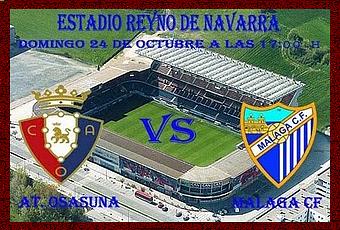 El Málaga afronta la octava jornada de liga a las 17:00 h del domingo 24 de octubre en el estadio Reyno de Navarra ante el AT. Osasuna, un estadio que desde que el Málaga es Cf. no lo ha visto perder, de ocho visitas a este campo se trajo cuatro victorias y cuatro empates, por lo tanto se puede decir que es un campo talismán para el Málaga, pero ni todos los partidos ni todas las temporadas son iguales, por tanto con el máximo respeto a Osasuna hay que salir muy enchufados al partido y procurar jugar con las líneas mas ajustadas que de costumbre, e intentar que no nos hagan tantos goles como en anteriores partidos, y eso si salir a ganar, porque este Málaga, de Ferreira siempre sale a ganar, y espero que esta vez no sea menos, ante un rival con todos mis respetos bastante accesible para este nuevo Málaga.