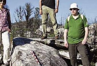 La historiadora Chelo Montaner con Juanjo Álvarez y el arqueólogo Jorge Lamas junto al petroglifo de Vilamarín recientemente descubierto. FOTO: FARO DEVIGO.