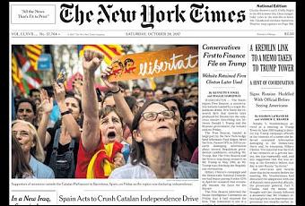 Los medios internacionales dedican sus primeras a la situación en Catalunya tras el cese de Puigdemont y todo su Govern, la disolución del Parlament y la convocatoria de elecciones autonómicas el 21 de diciembre, en aplicación de las medidas del 155. Le Monde, diario francés, se pregunta si el presidente del Gobierno español, Mariano Rajoy, “está a la altura” y si es “suficientemente 'creativo' e inteligentemente 'político”. El pasado lunes, arremetía duramente en su editorial contra la gestión del presidente de la Generalitat, Carles Puigdemont, y contra la línea “propagandística” de TV3. “Los independentistas –decía– viven en una burbuja, venden ilusión (...), pero no se atreven a organizar un escrutinio regional bajo el control de la autoridad electoral española (...). Prefieren la política de lo peor”. El texto subrayaba que España “vive una tragedia” impulsada por los independentistas y destacaba que el jefe del Ejecutivo catalán “se ha colocado fuera de la ley” y “ha asumido el riesgo de un cara a cara con Madrid que puede derivar en violencia. Puigdemont cuenta con una radicalización de una parte de la opinión (....).Y Le Monde insiste: “¿Qué hacer con la expresión de ese micro-nacionalismo ultra impulsado por gente que, por otra parte, denuncia los peligros del nacionalismo? Se puede tener la mayor simpatía por las aspiraciones de los catalanes de cara a una mayor autonomía. Se puede denunciar la actitud pasiva de Madrid desde 2010. [Pero] No se puede obviar que el señor Puigdemont tiene bien poco respeto por la democracia”. El rotativo estadounidense The New York Times titula “España actúa para frenar la deriva independentista catalana” en su portada impresa, una información ilustrada con la imagen de las concentraciones en el exterior del Parlament. El vicepresidente de la Generalitat cesado, Oriol Junqueras, manifestaba este miércoles su confianza en que la República catalana se consolidará “tarde o temprano”. “El valor que este país ha demostrado es tan esclarecedor y tan fuerte que, tarde o temprano, dará como resultado la consolidación de una República de Cataluña plena, verdaderamente justa y democrática”, vaticina en un artículo publicado en 'The New York Times'. Y España protesta contra 'NYT' por dar voz al vicepresidente Oriol Junqueras en un artículo de opinión. El periódico rectificó, presentándolo, como vicepresidente "destituido".