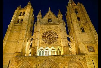 Obra de estilo gótico, de influencia francesa, cuyos vitrales coloreados constituyendo una de las mayores colecciones de vidrieras medievales del mundo. Durante la restauración del siglo XIX se descubrieron los restos de unas termas bajo la catedral, de los que apenas quedan unos mosáicos, tégulas y cerámicas que hoy se exponen en el Museo. En 1205 se inicia la construcción de la tercera catedral, aunque se paraliza la obra por problemas en los cimientos y no se vuelve a retomar hasta 1255, con el apoyo de Alfonso X el Sabio y bajo la dirección del maestro Enrique, tal vez de orígen francés, quien ya había intervenido con éxito en la catedral de Burgos. Ambas catedrales están inspiradas, al decir de los historiadores, en la planta de la catedral de Reims. La de León está edificada con un módulo geométrico basado en el triángulo, alejada de nuestra corriente en aquellos momentos, lo que merece el calificativo de "la más francesa de las catedrales españolas". Se dice también Pulchra Leonina, porque sus rasgos se relacionan con el gótico champaniense, sus significados simbólicos y programa arquitectónico están estrechamente ligados con los de la catedral de Saint Denis, la catedral de Notre Dame de París y la catedral de Reims. Geográficamente tampoco es ajena a aquel mundo, pues aunque levantada en la vieja capital de los reyes leoneses, la ciudad era uno de los hitos más importantes del Camino de Santiago, también llamado Camino Francés.