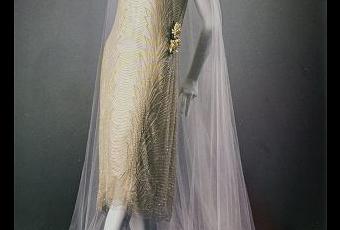 Dada su riqueza. actitud social, naturaleza independiente y asociación con los escritores más vanguardistas de la época, no es de extrañar que Harding llevará un vestido de novia muy chic. Su vestido, sin embargo, es más que elegante; está adelantado a su tiempo. Los diseños de vestidos variaron ampliamente en la década de 1920, pero era más probable que el diseño sobrio de este vestido se viera más adelante en la década. Aunque el vestido no conserva ninguna etiqueta o firma, sus detalles de elaboración y un vestido de noche en la colección del Museo de Arte de Cincinnati usado por Catharine Harding indican que, probablemente, fue hecho en Francia.