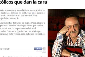 El reportaje que lleva por título “Católicos que dan la cara”, recoge opiniones de un ex entrenador de fútbol como Jabo Irureta, un actor como Santi Rodríguez, una escritora como María La Calle, un novelista como De Prada o un servidor. Arranca así: “En estos tiempos donde solo el 14% de los creyentes va a misa, declararse católico en público se ha convertido en una nueva forma de ‘salir del armario’. Puede leerse completo Aquí y dice esto sobre mí:“Si el padre Cárdenas busca adeptos para ‘Asaltar el Cielo’, un partido como Podemos sueña con «asaltar los cielos» de la política. Con un hondo apego a las calles y lejos de los altares, sectores de la Iglesia temen que sea el «brazo armado» del último arreón anticlerical. Pero de momento, solo han ‘crucificado’ a su número tres, Sergio Pascual, costalero de la Virgen de las Angustias de Sevilla. Antes de dejar el cargo, Pascual, diez años bajo las andas de la Hermandad de los Estudiantes, tuvo que luchar contra la línea dura del partido que quería desterrar la Semana Santa de su ciudad. Un contradiós en los aledaños de Triana. «A mí no me extrañaría que, con el tiempo, acaben relegadas a la periferia de un procesionómetro», se teme Juan Manuel de Prada.