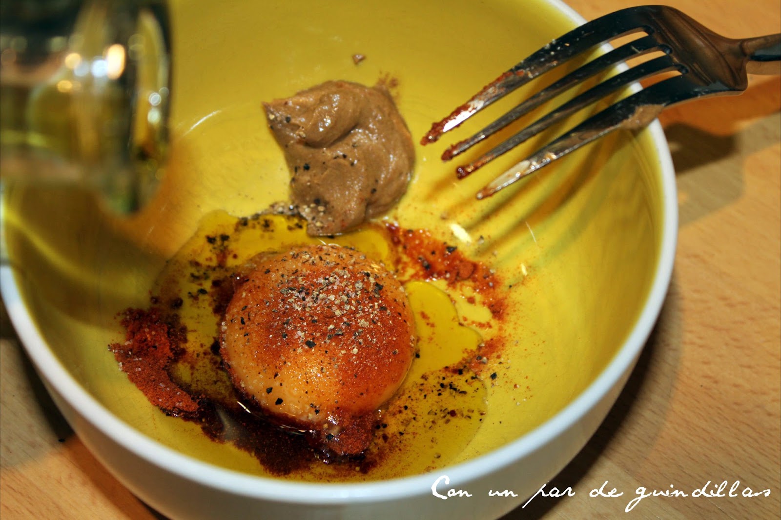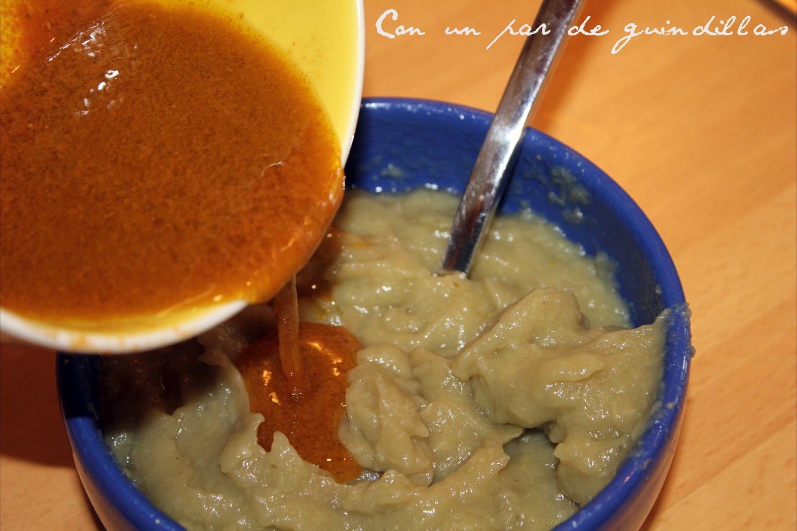 4.- Ligamos la yema con la mostaza, la sal, la pimienta, el pimentón y el aceite hasta que quede una pasta homogénea. La añadimos al puré de berenjena.