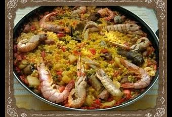 Hoy nos apetecía comernos una buena cazuela de arroz, y he decidido probar una receta de mi fabuloso libro, corpus del patrimoni culinari catalá INGREDIENTES: PARA 6 PERSONAS 600 g de arroz 500 g de costilla de cerdo cortada a trozos 300 g de pimiento verde cortadito a daditos 300 g de pimiento rojo cortadito a daditos 400 g de tomate maduro pelado y cortado a trocitos pequeños 100 g de guisantes 100 g de cebolla picadita 80 g de manteca de cerdo 18 almejas 6 salchichas de cerdo 6 gambas 6 cigalas6 galeras 2 sepias medianas peladas y cortadas a daditos Aceite de oliva 1 copita de malvasía de siges yo puse vino blanco ½ de caldo de carne ½ de caldo de pescado PARA LA PICADA: 2 cucharaditas de pasta de ajo http://www.ajopel.com/ Unas hebras de azafrán Sal Un puñadito de almendras tostadas http://www.agrocity.net/ ELABORACIÓN: Calentar el aceite con la manteca de cerdo en una paellera, y cuando este bien caliente añadiremos la costilla hasta que este doradita.Reserbarla Añadir la sepia en el mismo aceite, y cuando se allá bebido toda el agua que desprende, volvemos añadir la costilla, la cebolla y los pimientos dejamos que valla pochando un poco todo junto. Añadiremos el tomate, el vaso de vino y un poco de sal. Dejaremos cocer a fuego lento durante media hora, añadiremos el caldo de carne y el de pescado y añadiremos los guisantes. Cuando empiece a hervir, añadiremos el arroz y la picada a media cocción, añadiremos las cigalas, las gambas, las galeras,las salchichas y las almejas. Probaremos de sal y lo acabaremos de cocer en el horno para que coja un poco de color por encima.