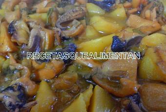 Un kg. chocos o sepias, 500 gr. patatas, una cebolla, un tomate, 3 dientes de ajo, perejil, dos cucharaditas de colorante, una cucharadita de pimentón dulce, aceite de oliva, agua, pimienta, agua, sal.