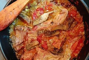Ingredientes para 4 personas:1 conejo troceado4 alcachofas1 cebolla2 dientes de ajo2 tomates maduros1/2 pimiento rojo1/2 vaso de vino rancio1 vaso de agua o caldo de verduras1 cucharada de pimentónPimienta molidaUna ramita de romero o tomillo al gustoAceite de olivaSal