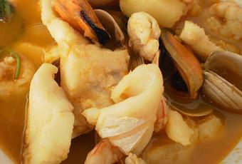 Colar el refrito sobre el caldo de los mariscos, rectificar de sal y llevar a ebullición.
