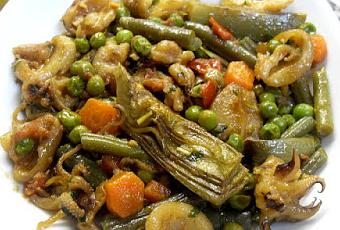 Limpiar y lavar la sepia. Eliminar el exceso de agua con papel absorbente de cocina. Y cortar en trozos.Limpiar las alcachofas, quitando las hojas exteriores más duras y el tallo.