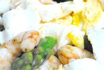 Se trata de una receta de cazuelita de gambones, ajos tiernos y espárragos con huevos rotos que está para chuparse los dedos.