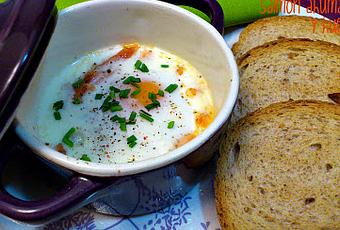 3.- Retiramos los moldes del hono y los dejamos enfriar unos minutos. Después, espolvoreámos por encima con trocitos de cebollino y acompañamos las cazuelitas con pan tostado.