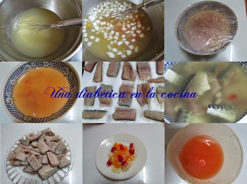 Cortamos los filetes en trozos regulares y los sumergimos en la salmuera durante 5 minutos. Salmuera que prepararemos mezclando la sal con el agua caliente hasta que se disuelva la sal. Una vez fría la mezcla ya podremos introducir el pescado.