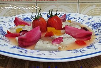 - Pelamos y lavamos la cebolla roja, la cortamos en juliana y la escaldamos en agua hirviendo durante 20 segundos, la enfriamos enseguida en agua helada, la retiramos y la escurrimos. Después la cubrimos con el vinagre y lo dejamos marinar durante una hora.