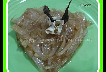 Poner en la cubeta de la GM E la cebolla y el aceite, remover bien, tapar con válvula cerrada, programa menú presión vapor, 130º, alta presión (3) cuando termine despresurizar manualmente, abrir y añadir el rsto de ingredientes, programar menú plancha tapa abierta, ir removiendo de vez en cuando, hasta que reduzca todo el liquido (no consume el tiempo) cuando este, cancelar la olla y ya la tenemos lista para comer acompañada en este caso de un filete empanado vegetal buenísima