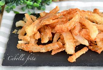 El secreto de que la cebolla quede crujiente no es otro que sumergirla una media hora en agua fría, basta pasarla por harina y freírla, el crujiente está asegurado.