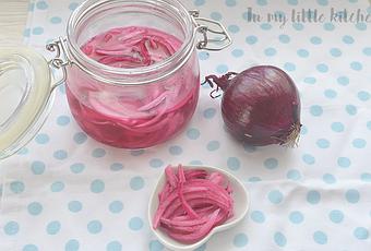 Ingredientes- 1 cebolla roja mediana.- 125 ml. de vinagre de manzana.- 200 ml. de agua templada.- 1 cucharada sopera de azúcar.- 1 cucharadita y media de sal.