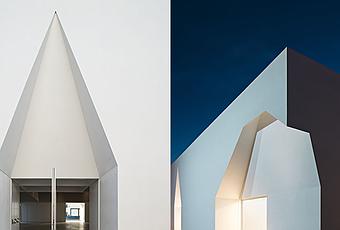 Arcos triangulares profundos, recortes afilados y planos perforados abiertos en las fachadas blancas sin adorno, proporcionan puntos de entrada o ventanas que enmarcan las vistas exteriores del casco histórico del pueblo del distrito de Setúbal.