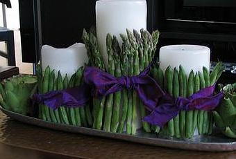 Su realización es simple, cogeremos en primer lugar los espárragos, los cortaremos todos a la misma altura y poco a poco los iremos colocando alrededor de una vela y los sujetaremos con una gomilla de caucho o con un elástico que tengamos a mano. El mismo procedimiento seguiremos con las vainas, aunque éstas no se cortan. Una vez tengamos montadas nuestras composiciones le pasaremos un lazo para que no se vea la goma que sujeta las verduras a la vela y terminaremos el conjunto incluyendo un par de alcachofas a las que cortaremos la base y ahuecaremos para colocar unas velitas en su interior. Lo ideal para que nuestro centro dure es ponerlo sobre una bandeja con un poco de agua para que la verdura dura más.