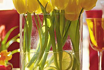 Hoy os dejamos un original centro de mesa realizado con flores y limones. Si te gusta el color amarillo, esta combinación entra rodajas de limones y tulipanes amarillos te vendrán estupendamente. Como veis su realización es muy simple, sólo tenemos que cortar varios limones en rodajitas muy finas y colocarlas en el interior del agua de nuestro jarrón, añadimos las flores y tendremos un bonito centro de mesa. El único inconveniente que le vemos esque el ácido del limón quizás estropee antes las flores, pero bueno, para una ocasión en concreto, es una forma muy bonita y original de decorar una mesa.via|modayhogar