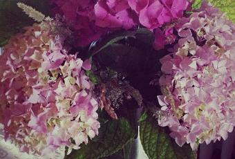 Una idea para centro de mesa que a mi personalmente siempre me encanta, es un buen ramo de flores. En mi caso, tengo la suerte de poder usar elementos de mi jardín y acabo creando centros como este: