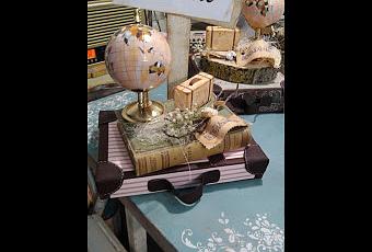 Temática viajera, compuestos todos ellos por una maleta de base sobre la que hemos colocado libros antiguos o ruedas de tronco natural, decoradas con bolas del mundo, maletas, flor natural y carteles con ciudades que son importantes para los novios, un cartel grande que después se puede quitar y otro más pequeño estampado en tela.