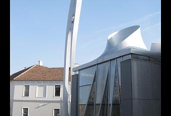 Hasta esta localidad se desplazaron los arquitectos del equipo Coop Himelb(l)au para desarrollar las obras de la recién finalizada iglesia "Evangelische Martin Luther". Tuvimos la suerte de recibir las agradables explicaciones de "Adolf Reichel", encargado de la misma y alma del desarrollo del proyecto: la cubierta y el altar, que aluden a la sagrada familia, con tres aberturas que proporcionan luz cenital y apoyo respectivamente; las dos salas para la celebración; la sala de reuniones, calderas, baño, cocina... Hasta llegar a la parte posterior, donde se encuentra un pequeño jardín, desde el que se tiene la mejor vista de la cubierta y el campanario, las piezas más simbólicas del proyecto.