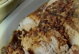 Retirar el exceso de marinada de la carne y meterlo en le horno, sobre la rejilla. Cocinar 1/2 hora a 220ºC y bajar después a 190ºC. Tapar la parte superior del cerdo con papel de aluminio para que no se queme y dejarlo durante 90 minutos más o hasta que un termómetro pinchado en el centro marque 70ºC.