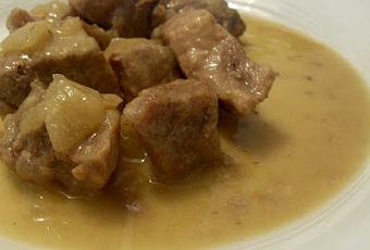 Ahora ya preparamos la salsa añadiendo a la carne el vino blanco, dar unas vueltas y dejar evaporar un par de minutos, seguidamente añadir el caldo, toda la nata vegetal sin lactosa, las dos cucharadas de mostaza y dejar cocer a fuego lento unos 30 minutos, hasta que la salsa reduzca su volumen.