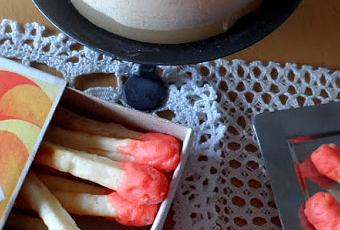 Cortamos tiras de masa brisa de ½ a 1 cm de ancho, unos 7cm de largo y un grosor de ½ cm aproximadamente.Ponemos separadas en la bandeja de horno y las metemos a cocer en horno precalentado a 180º unos 10 minutos (cuidado que no se nos quemen).