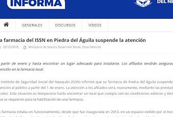 En el portal OnLine neuqueninforma.gob.ar habla que la farmacia del ISSN en Piedra del Águila suspende la atención. Que a partir de enero y hasta encontrar un lugar adecuado para instalarse, los afiliados tendrán asegurada la atención en la farmacia local. En su momento fue precisamente esto último lo que llevo al ISSN a colocar la Farmacia. Ahora asegura la atención de los afiliados, quizás esto sea lo más acertado que nadie se anima a anunciar. Tampoco estaría mal por ser la Farmacia del Pueblo y a la que el 99,99% asiste. Neuquén Informa remata la nota diciendo que, la farmacia estaba en funcionamiento, desde que fue inaugurada en 2013, en un espacio cedido por el hospital público local. Ahora, desde esa institución solicitan ese lugar para mejorar la atención a la población.