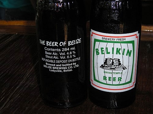 Cervezas en BeliceLa cerveza Belikin es la más popular, al frente tiene el Templo maya de los Altares de la localidad de Altún Ha y detrás la leyenda; “The beer of Belize”