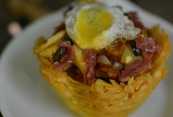 Ya es hora de armar las cestas de patatas, rellenándolas con las patatas, pimiento y cebollas que acabas de sacar de freír, le pones un poco de jamón serrano cortado en tiras y el huevo de codorniz encima, es un plato exquisito, que debes acompañar con un buen pan de corteza dura y un vino tinto potente. Simplemente maravilloso!