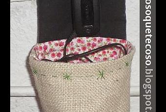 Tanta cesta, tanta cesta, que si para las patatas, para las cebollas, para bollería, para cinturones, para bolsas, para, para, para...., que yo no paro.Esta vez la cesta es para el móvil y su cargador.Como mis enchufes son negros, he puesto el cuadrado superior en negro y así no desentona.Después una arpillera en color blanco roto, y unas florecitas de piqué para alegrar el interior.En el borde de la cesta he hecho rayas y cruces en hilo verde para que esté vestida pero informal.Es sólo una idea...Y sigo coso que te coso...