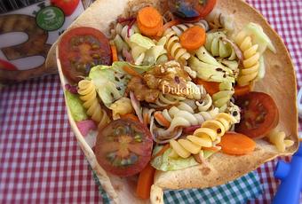 Después de unas ajetreadas semanas en las que he pasado de casi todo, vuelvo de nuevo, poco a poco, a estar por aquí y empiezo enseñándoos una sencilla pero deliciosa y nutritiva ensalada de pasta, completita y sana que, en esta ocasión, he presentado dentro de una "cestita o bol" comestible que da el toque crujiente al plato y un punto de originalidad en su presentación.