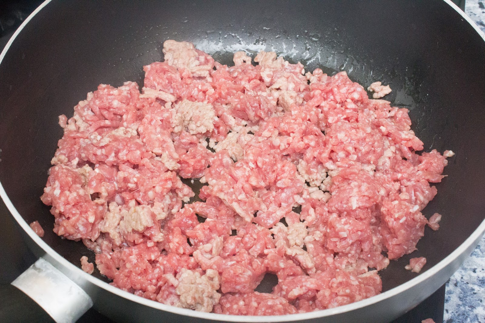 Pon la carne picada con un poco de aceite en una sartén onda. Tienes que ir aplastándola con la cuchara de madera poco a poco para que no se hagan bolas y quede la carne desmigadita.
