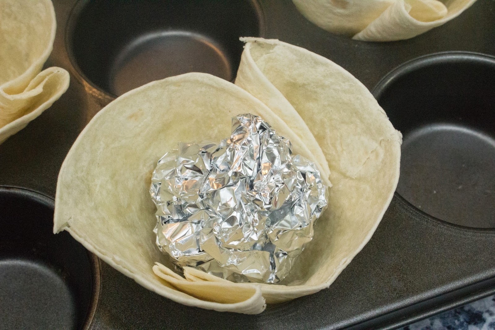 Mete las fajitas pequeñas en el molde de cupcakes. Haz primero como un piquito para abajo para meterla y luego la colocas ahí.