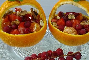 Transcurrido este tiempo, regar las frutas con abundante miel y llenar con ellas las cestitas de naranjas, poner encima las nueces y las grosellas, decorar las cestitas con un tallito de menta y guardar en el frigorífico hasta el momento de servir.